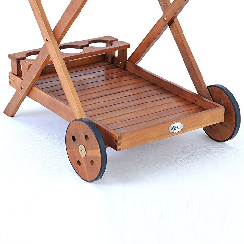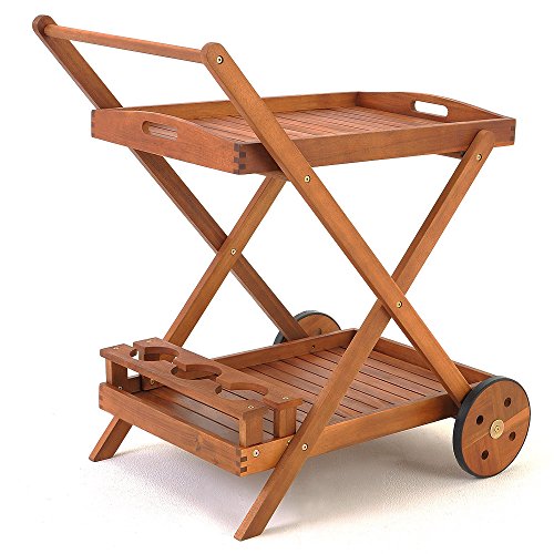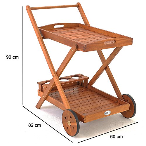 Schöner und sehr praktischer Servierwagen, der auf zwei Etagen genügend Platz für Gläser, Teller u.a. bietet. Produktvorteile: – Servierwagen aus tropischem Hartholz (Akazie) – tolles Design – gefertigt in Handarbeit – Serviertablett des Wagens kann zum Auftischen abgenommen werden – das untere Tablett besitzt einen Getränkehalter für 3 Flaschen und eine große Tablettfläche für z.B. Geschirr – der untere Wagenraum bietet genügend Platz für größere Transporte Technische Daten: – Maße: 82 x 60 x 90 cm (L/B/H) – Durchmesser Räder: 22 cm – Maße abnehmbares Tablett: 70 x 47 x 8 cm (L/B/H) Lieferumfang: 1 x Servierwagen – Aufbauanleitung – Montagematerial