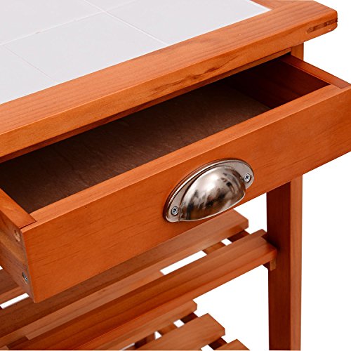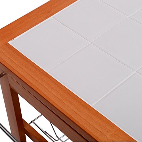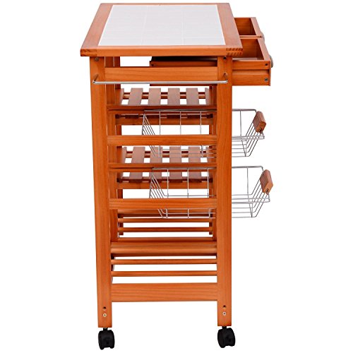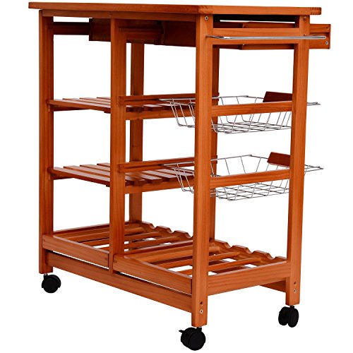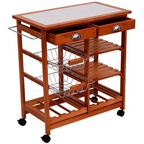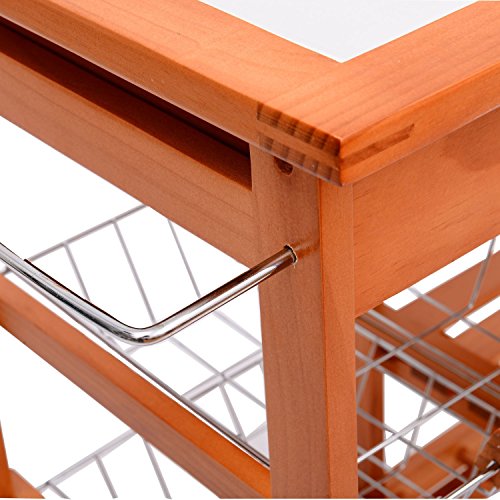 Beschreibung:· Mehrzweckküchenwagen aus Holz· praktischer Küchenwagen aus hochwertigem, lackiertem Holz und Metallelementen · pflegeleicht · bietet viel Stauraum · große Arbeitsfläche (67x37cm) mit Fliese · 2 Ablagefächer · 4 Rollen, 2 davon mit Stopper-Funktion · inkl. Montagematerial und Aufbauanleitung · einfache Montage Technische Daten: ·Material: Kiefer, Metall ·Farbe: honigfarben ·Maße: 74 x 37 x 75 cm (L x B x H) ·2 Schubladen mit Metallgriff: 28 x 29 x 6 cm(L x B x H) ·2 Schubkörbe mit Holzgriff: 29 x 28 x 6cm(L x B x H) ·2 Weinregale: 32 x 29cm(L x B) ·Durchmesser vom Rad: 4,5 cm ·Gewicht: 10,5 kg ·Max. Belastbarkeit: 50kg Lieferumfang: ·1 x Küchenwagen