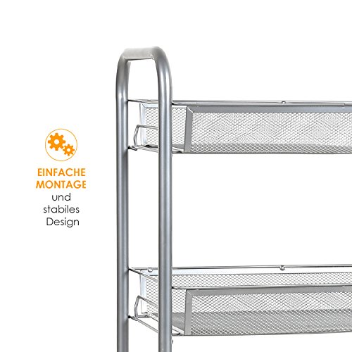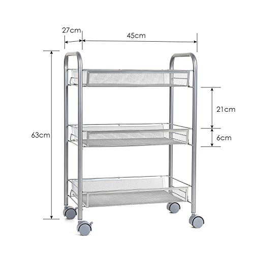 Beschreiung: HOMFA Rollwagen ist dafür ausgelegt, um etwas zusätzliche Fläche in der Küche, im Bad oder in der Vorratskammer zu haben. Robust und stabil: Die Stahlrohr und 3 Korbablagen schaffen ausgezeichnete Stabilität Leicht zu montieren: Man braucht nur den Rahmen in ein paar Minuten zusammenzuschrauben, und Korbablagen darauf zu legen, fertig. Die Rollen lassen sich auch einfach in die Rohre einstecken Multifunktion: HOMFA Allzweckregal kann als Badregal,Küchenregal,Gewürzregal Blumenregal benutzt werden, entspricht alle Ihrer Nachfragen. Durch die vier Rollfüße lässt sich der Wagen gut in verschiedene Ecken schieben, zwei davon verfügen über Bremsen. Material: Kohlenstoff Stahl + PP Kunststoff Farbe: Silbergrau Größe: 45*27*63cm belastbar bis 20kg