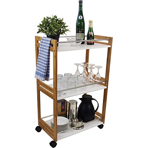 Vielseitiger Helfer auf Rollen!Dieser stabile und praktische Rollwagen im modernen Design bietet viel Stauraumfür verschiedenste Utensilien. Der Wagen verfügt über 3 Abstellflächen. Damit beimTransport nichts verloren geht, sind die Ablagefächer seitlich mit Stangen gesichert.An die Stangen lassen sich außerdem Küchenutensilien mit Haken anbringen oder Geschirrtücherablegen. Durch die Rollen lässt sich der Beistellwagen ganz leicht verschieben und dort einsetzen,wo er benötigt wird. 2 der 4 Rollen lassen sich feststellen, so dass ein sicherer Stand gewährleistet ist.Dieses Möbelstück ist im ganzen Haus einsetzbar und somit ideal geeignet zum Servieren, Transportierenund als Stauraum für Geschirr, Lebensmittel, Getränke, Reinigungsmittel, Badutensilien, Bücher etc.Montage:Der Servierwagen wird mit einer bebilderten Aufbauanleitung und Montagematerial verschickt.Für die Montage wird kein zusätzliches Werkzeug benötigt. Die Montagezeit beträgt ca. 15 Minuten.Details:- Servierwagen- 4 Rollen je 360°, davon 2 feststellbar- 3 Ablagefächer mit Edelstahl-Stangen- Gesamtgröße (BxTxH): ca. 51x30x80cm- Größe je Fach (BxT): ca. 48x26cm- Abstand zw. den Fächern: ca. 33cm- Material: Holz/MDF, Edelstahl- Einfache Montage (Schraubsystem)- Gewicht: ca. 6kgDie Dekoration ist nicht im Lieferumfang enthalten!