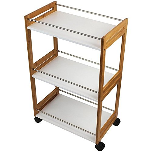 Vielseitiger Helfer auf Rollen!Dieser stabile und praktische Rollwagen im modernen Design bietet viel Stauraumfür verschiedenste Utensilien. Der Wagen verfügt über 3 Abstellflächen. Damit beimTransport nichts verloren geht, sind die Ablagefächer seitlich mit Stangen gesichert.An die Stangen lassen sich außerdem Küchenutensilien mit Haken anbringen oder Geschirrtücherablegen. Durch die Rollen lässt sich der Beistellwagen ganz leicht verschieben und dort einsetzen,wo er benötigt wird. 2 der 4 Rollen lassen sich feststellen, so dass ein sicherer Stand gewährleistet ist.Dieses Möbelstück ist im ganzen Haus einsetzbar und somit ideal geeignet zum Servieren, Transportierenund als Stauraum für Geschirr, Lebensmittel, Getränke, Reinigungsmittel, Badutensilien, Bücher etc.Montage:Der Servierwagen wird mit einer bebilderten Aufbauanleitung und Montagematerial verschickt.Für die Montage wird kein zusätzliches Werkzeug benötigt. Die Montagezeit beträgt ca. 15 Minuten.Details:- Servierwagen- 4 Rollen je 360°, davon 2 feststellbar- 3 Ablagefächer mit Edelstahl-Stangen- Gesamtgröße (BxTxH): ca. 51x30x80cm- Größe je Fach (BxT): ca. 48x26cm- Abstand zw. den Fächern: ca. 33cm- Material: Holz/MDF, Edelstahl- Einfache Montage (Schraubsystem)- Gewicht: ca. 6kgDie Dekoration ist nicht im Lieferumfang enthalten!
