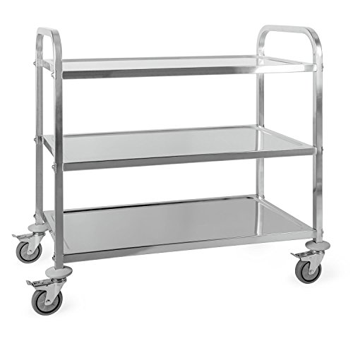 Edelstahl-Servierwagen in klassischem Design für jede Art vonGastronomiegewerbe. 4 leichtläufige Vollgummirollen, die einzeln fixierbar und um 360° drehbarsind. Stabile Stahlböden mit großen Stellflächen und je 28 cm Zwischenabstand nachoben. Der The Great Gatsby von OneConcept ist ein edler Servierwagen inklassischem Design und dank seiner stabilen Konstruktion bestens für dentäglichen Gebrauch in Großküchen, Kantinen, Kitas und Pflegeheimen eignet. Die drei großen Böden bieten mit ihren 28 cm Zwischenabstand und 44 x 84 cmgroßen Stellflächen genügend Platz für allerlei Geschirr, Besteck , Gläser und viele weitere Küchenutensilien. 4 kugelgelagerte Leichtlaufrollen aus Vollgummi sorgen für minimalenRollwiderstand und lassen sich einzeln per Feststellbremse schnell und festfixieren. Mit ihren ebenfalls kugelgelagerten Gelenken ist jede Rolle um 360°drehbar und bietet daher maximale Wendigkeit zwischen enger Bestuhlung und ungünstig stehenden Hochzeitsgästen. Der Aufbau des The Great Gatsby's ist kinderleicht und bedarf neben desbeiliegenden Imbus-Schlüssels keinerlei weiterer Werkzeuge. Eigenschaften • 480 kg maximale Belastung• 3 Tabletts• 0,8 mm Tablettdicke• 28 cm Tablettabstand Lieferumfang • 3 x Boden• 2 x Seitenteil• 4 x Rollen• 12 x Unterlegklammer• 12 x Schraube• 4 x Unterlegscheibe• 4 x Schraubenmutter• Imbus-Schlüssel• bebilderte Anleitung Abmessungen • ca. 101 x 96 x 56 cm (BxHxT)• Gewicht: ca.13,5 kgWeitere Artikel aus der Kategorie Servierwagen amazon.de/b/?me=ABV9J41D2VYA9&node=2880533031Besuchen Sie unseren OneConcept Markenshopamazon.de/gp/node/?me=ABV9J41D2VYA9&node=3633432031