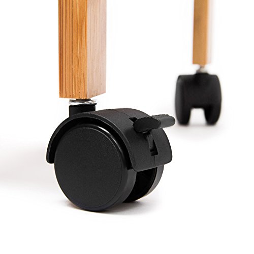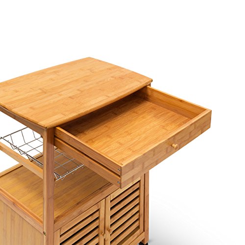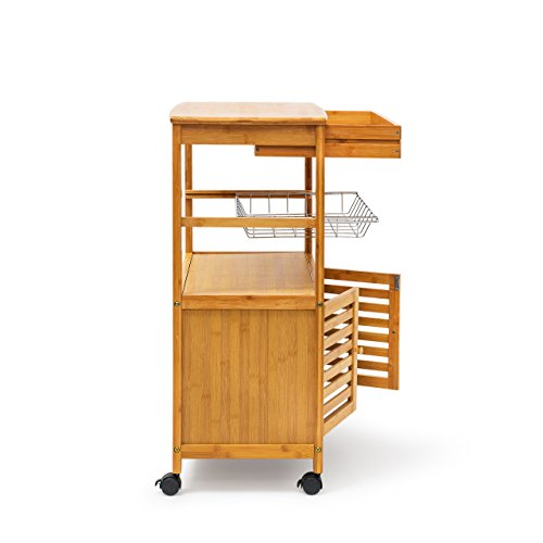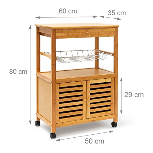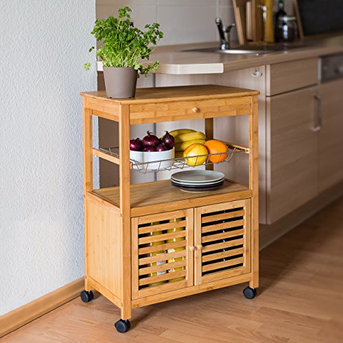 Die Servierwagen der JAMES Reihe bestechen durch ihre robuste Bauweise und das praktische Design. Mit diesen Helfern können Sie Geschirr, Flaschen, ganze Gerichte und vieles mehr bequem und unkompliziert transportieren. Auch als Beistelltisch sind die Rollwagen ideal geeignet. Der verwendete Bambus sieht dabei stets toll aus und ist zugleich äußerst robust.Der Küchenwagen der Größe XL verfügt über ein Schrankfach mit 2 verschließbare Türen, eine Schublade, 2 große Ablageflächen sowie einen Metallgitter-Korb. Letzteren können Sie zur separaten Verwendung auch entnehmen.Details des Küchenrollwagens JAMES XL• Größe H x B x T: ca. 80 x 60 x 35 cm• Wiegt ca. 10 Kg• Maße des Korbs: ca. 5,5 x 48,5 x 30,5 cm• Maße des Schrankteils: ca. 29 x 50 x 29 cm• Material: 100% Bambus, Korb aus verchromtem Stahl• 4 bremsbare Rollen• Traglasten: obere Ablage 30 Kg, Korb 10 Kg, restliche Ablagen 10 KgSchicker Servierwagen aus Bambus• Schöne Maserung des Holzes• Küchenbutler in rustikalem Landhaus Stil• Perfekt zum Transport von Obst, Wein, Buffet, Geschirr uvm.• Mit praktischer Schublade für Geschirr, Servietten uvm.Lieferumfang• 2x Seitenteile, 1x Korb, 1x Schrank, 1x Schublade, 1x Ablage, 4x Rollen• Anleitung & Montagematerial• Dekorationsartikel sind im Lieferumfang nicht enthalten