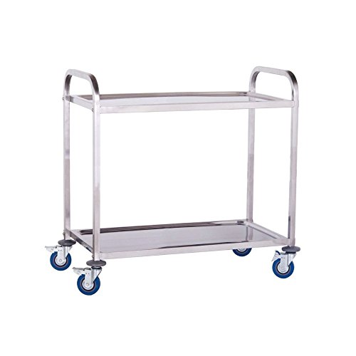 Edelstahl Servierwagen mit 2 Böden Der Servierwagen RCSW-2 von Royal Catering besticht durch klassisches Design in Kombination mit sehr gut verarbeiteten Materialien. Durch 2 stabile Böden ist der Abräumwagen äußerst belastbar und langlebig. Die Verwendung von Edelstahl ermöglicht den täglichen Einsatz sowohl in Großküchen, Kantinen als auch in Kindertagesstätten, Pflegeheimen oder für den ambitionierten Hobbygastronomen. Gehärteter Edelstahl ist hygienisch, leicht zu reinigen und zeigt auch Ihren Kunden, wie hoch Ihr eigener Qualitätsanspruch ist. Der Edelstahl Servierwagen verfügt über 4 Leichtlaufrollen aus Vollgummi für wenig Rollwiderstand und eine geringe Geräuschentwicklung. Alle Rollen sind kugelgelagert und um 360° drehbar, wodurch der Wagen sehr wendig ist und sich Ihren Bedürfnissen jederzeit anpasst. Eine spezielle Konstruktion mit Kontermutter erlaubt eine einfache Montage und eine wackelfreie Ausrichtung. Jedes Rad hat eine separate Feststellbremse, sodass ein fester Stand gewährleistet ist. Außerdem ist um jedes Rad ein Rammschutz montiert, sodass sowohl Ihr Inventar als auch der Wagen lange Zeit gut erhalten bleiben. Der Aufbau des Servierwagens ist kinderleicht und erfordert keine Fachkenntnisse. Eine deutsche Anleitung liegt natürlich ebenfalls bei. Technische Details RCSW-2 aus Edelstahl gefertigt maximale Belastung: 320 kg 2 Ablageböden Tablettdicke: 3 cm Tablettabstand: 62 cm Maße: 101 x 55 x 96,50 cm Gewicht: 11 kg