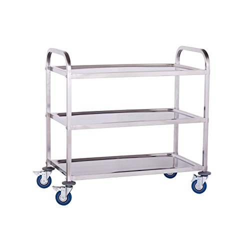 Edelstahl Servierwagen mit 3 Böden Der Servierwagen RCSW-3 von Royal Catering besticht durch klassisches Design in Kombination mit sehr gut verarbeiteten Materialien. Durch 3 stabile Böden ist der Abräumwagen extrem belastbar und langlebig. Die Verwendung von 100% Edelstahl ermöglicht den täglichen Einsatz sowohl in Großküchen, Kantinen als auch in Kindertagesstätten, Pflegeheimen oder für den ambitionierten Hobbygastronomen. Gehärteter Edelstahl ist hygienisch, leicht zu reinigen und zeigt auch Ihren Kunden, wie hoch Ihr eigener Qualitätsanspruch ist. Der Edelstahl Servierwagen verfügt über 4 Leichtlaufrollen aus Vollgummi für wenig Rollwiderstand und eine geringe Geräuschentwicklung. Alle Rollen sind kugelgelagert und um 360° drehbar, wodurch der Wagen sehr wendig ist und sich Ihren Bedürfnissen jederzeit anpasst. Eine spezielle Konstruktion mit Kontermutter erlaubt eine einfache Montage und eine wackelfreie Ausrichtung. Jedes Rad hat eine separate Feststellbremse, sodass ein fester Stand gewährleistet ist. Außerdem ist um jedes Rad ein Rammschutz montiert, sodass sowohl Ihr Inventar als auch der Wagen lange Zeit gut erhalten bleiben. Der Aufbau des Servierwagens ist kinderleicht und erfordert keine Fachkenntnisse. Eine deutsche Anleitung liegt natürlich ebenfalls bei. Technische Details RCSW-3 100 % Edelstahl 480 kg maximale Belastung 3 Tabletts Tablettdicke: 3 cm Tablettabstand: 28 cm Maße: 101 x 55 x 96,5 cm Gewicht: 13,70 kg