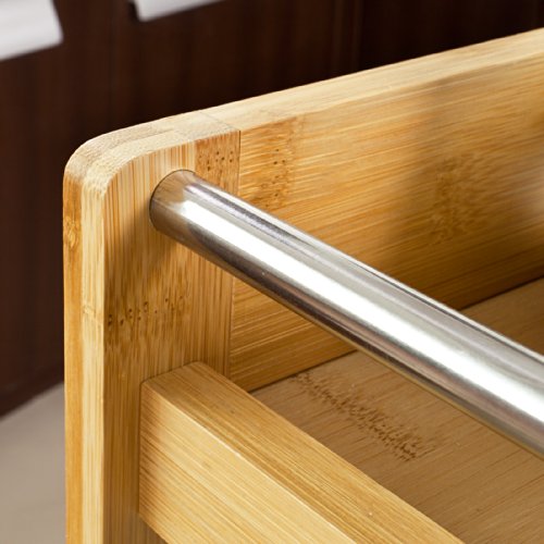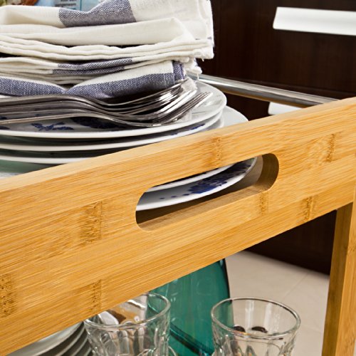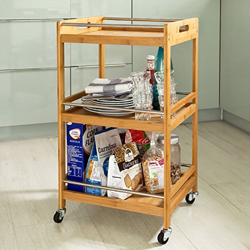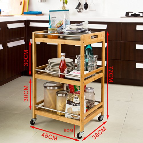 Dieser Küchenwagen aus Bambusholz ist stabil und bietet sehr viel Stauraum für verschiedenste Utensilien in Ihrer Küche oder Ihrem Badezimmer. Das Bambusholz ist wasserabweisend, somit kann der Küchenwagen auch als Badezimmerregal Ihr Badezimmer verschönern. Der Küchenwagen hat vier stabile Rollen, auf denen sich der Tisch leicht verschieben lässt. Außerdem bietet das Regal eine optimale Ablagefläche für Handtücher, Kosmetik, Dekoration und viele andere Dinge. Das Regal verfügt über drei Ablagefächer. Weiterhin erweist sich das Regal durch sein exklusives Design als echter Blickfang für jeden Raum. Dieser Artikel ist farblos lackiert und poliert. Zum aufbauen werden Edelstahlschrauben verwendet und selbstverständlich wird eine Aufbauanleitung mit geliefert.