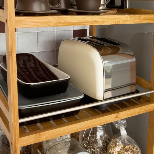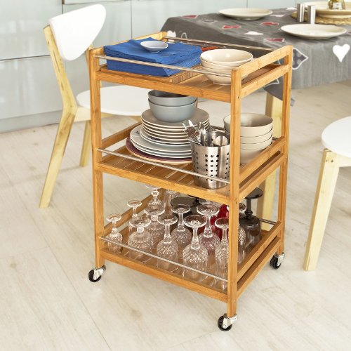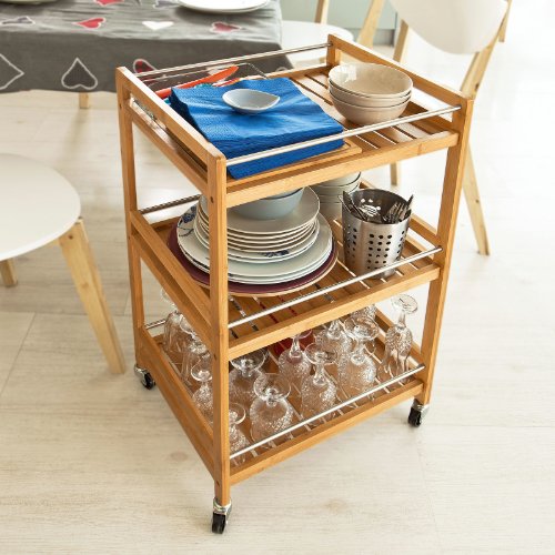 Dieser Küchenwagen aus Bambusholz ist stabil und bietet sehr viel Stauraum für verschiedenste Utensilien in Ihrer Küche oder Ihrem Badezimmer. Das Bambusholz ist wasserabweisend, somit kann der Küchenwagen auch als Badezimmerregal Ihr Badezimmer verschönern. Der Küchenwagen hat vier stabile Rollen, auf denen sich der Tisch leicht verschieben lässt. Außerdem bietet das Regal eine optimale Ablagefläche für Handtücher, Kosmetik, Dekoration und viele andere Dinge. Das Regal verfügt über drei Ablagefächer. Weiterhin erweist sich das Regal durch sein exklusives Design als echter Blickfang für jeden Raum. Dieser Artikel ist farblos lackiert und poliert. Zum aufbauen werden Edelstahlschrauben verwendet und selbstverständlich wird eine Aufbauanleitung mit geliefert.