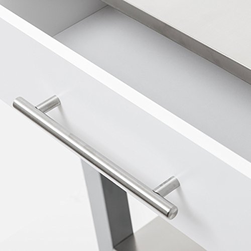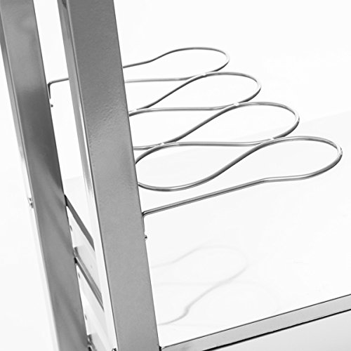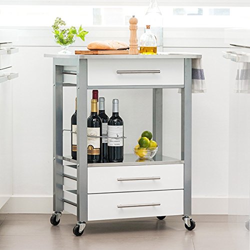 Küchenwagen 60x50x84,5cm Beistellwagen Küchenrollwagen Servierwagen RollwagenDieser moderne Küchenwagen mit Metallrahmen bietet mit seinen drei Schubladen viel Stauraum und ist daher auch für kleine Küchen ideal geeignet. Der Küchenrollwagen verfügt zudem über ein Weinregal mit Platz für sieben Flaschen. Dank der vier Lenkrollen lässt sich der Beistellwagen leicht bewegen. Zwei Feststellbremsen sorgen außerdem für sicheren Stand und verhindern unbeabsichtigtes Verschieben des Küchenwagens. Arbeitsplatte und Ablage des Rollwagens sind aus Edelstahl gefertigt und dadurch hygienisch und leicht zu reinigen.Produktmerkmale:Küchenwagen mit stabilen Metallgestelldrei Schubladen mit reichlich StauraumArbeitsplatte und Ablage aus EdelstahlWeinregal mit Platz für sieben Flaschenvier Lenkrollen, davon zwei mit FeststellbremseTechnische Daten: Ausführung: KüchenrollwagenMaße gesamt: (BxTxH) ca. 60 x 50 x 84,5 cmGewicht: ca. 16,5 kgFarbe: weiß / silber3 SchubladenMaterial Gestell: Metall pulverbeschichtetMaterial Arbeitsplatte und Ablage: Edelstahl4 Lenkrollen (davon 2 mit Feststellbremse)Weinregal für 7 FlaschenWeitere praktische Helfer für Küche und Haushalt finden Sie in unserem Shop!