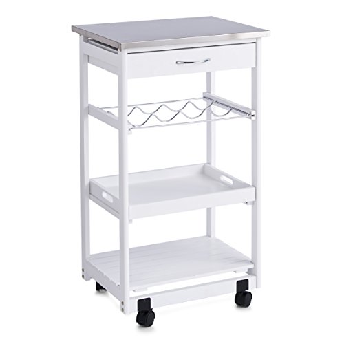 Küchenrollwagen aus hochwertigem Kiefernholz mit Edelstahltop und Stauraum für 4 Flaschen herausnehmbares Tablett und praktische Schublade alle Rollen frei beweglich, 2 mit Feststellbremsen Schnelle und einfache Selbstmontage